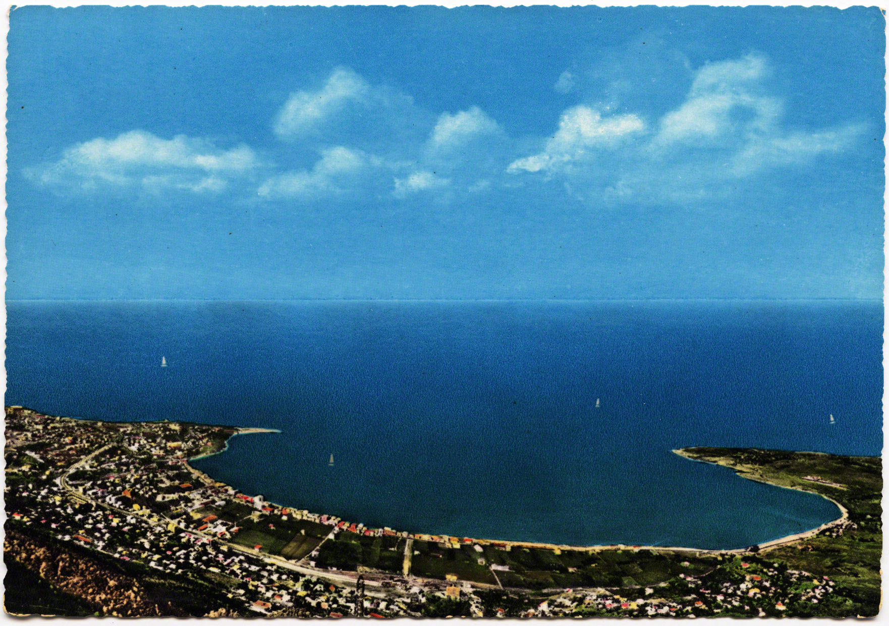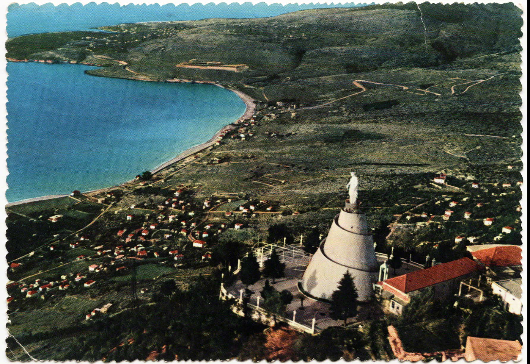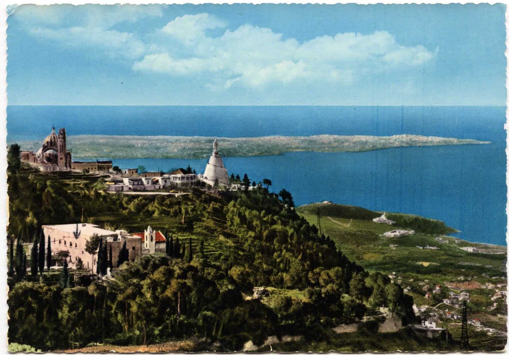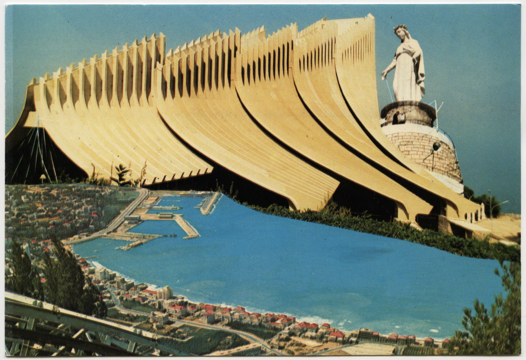 Take for instance these three following cards which play with scale: first, before the days of Photoshop, she looms totally out of proportion over the bay as if to increase her prowess; second, we oddly see a view of her looking south, as if she were looking over Beirut in the distance; third, the view she might sees from her marble eyes. The entire bay of Jounieh is visible from North to South..