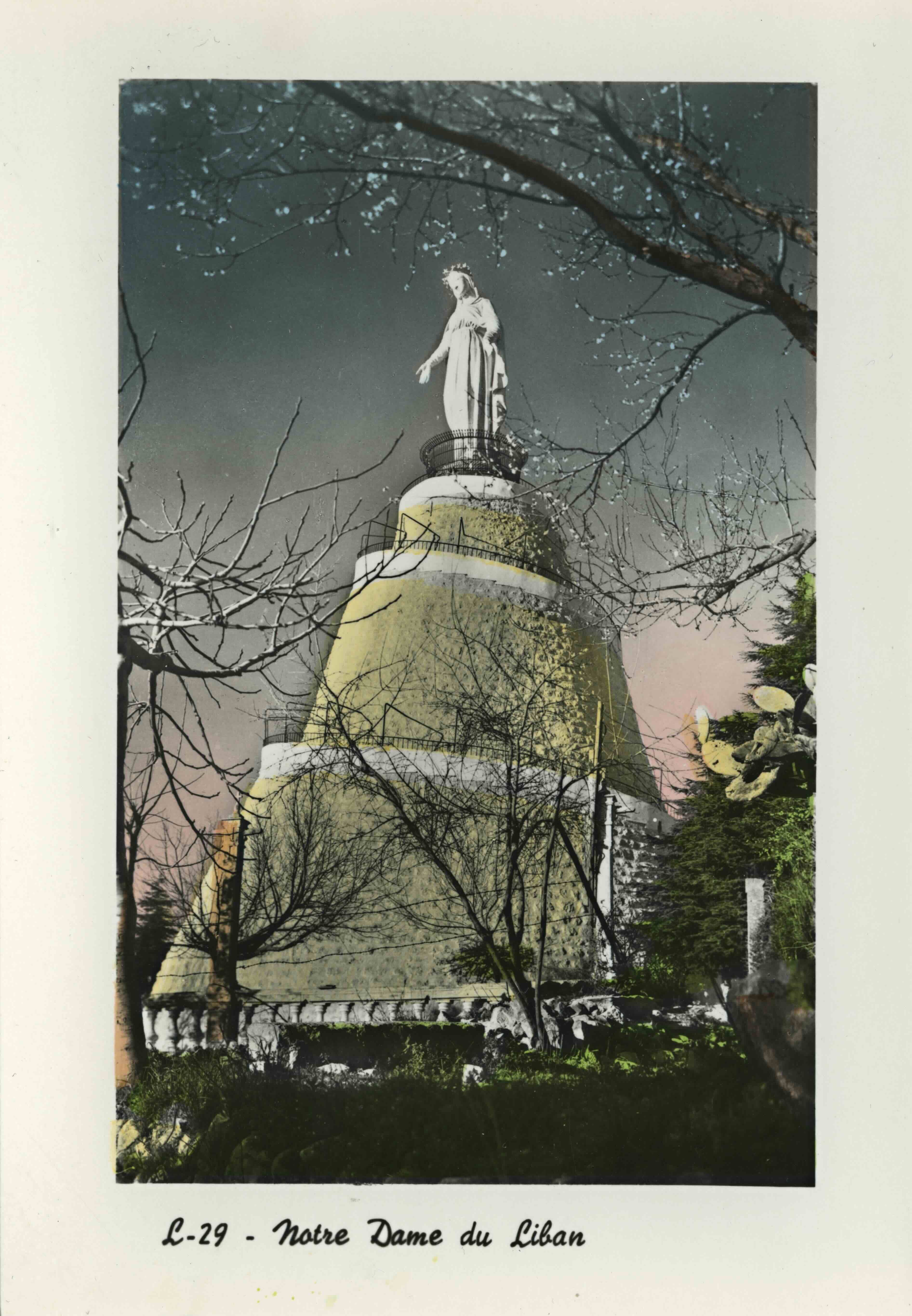The placement of this physical statue is significant but so is the linkage of her body to the landscape. The landscape on which she emerges, to the larger body of the nation. Such imagery might make one think that the nation is filled with certain types (Christians) that live below her feet. The images of her, and the bay of Jounieh, are linked henceforth in postcards.