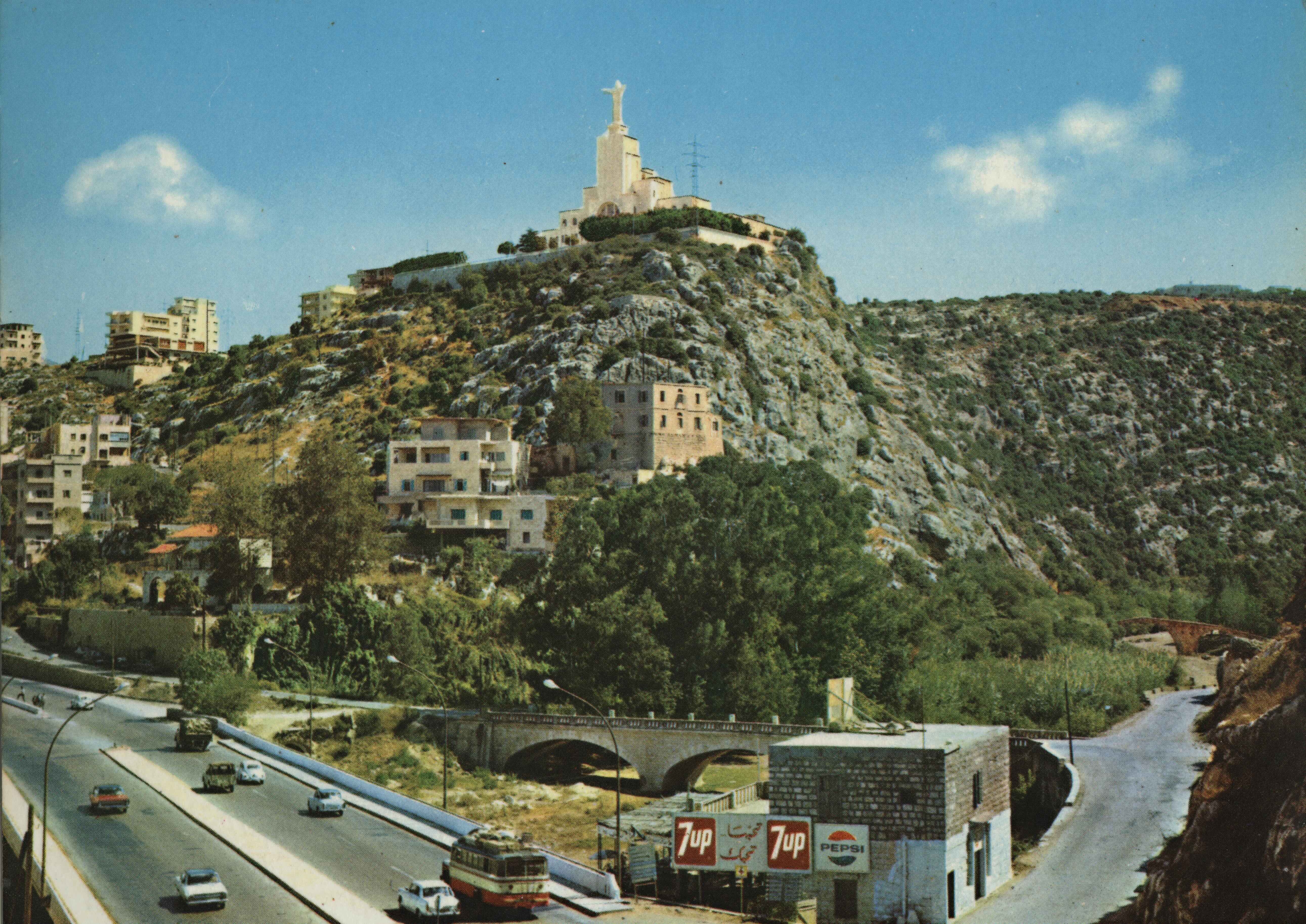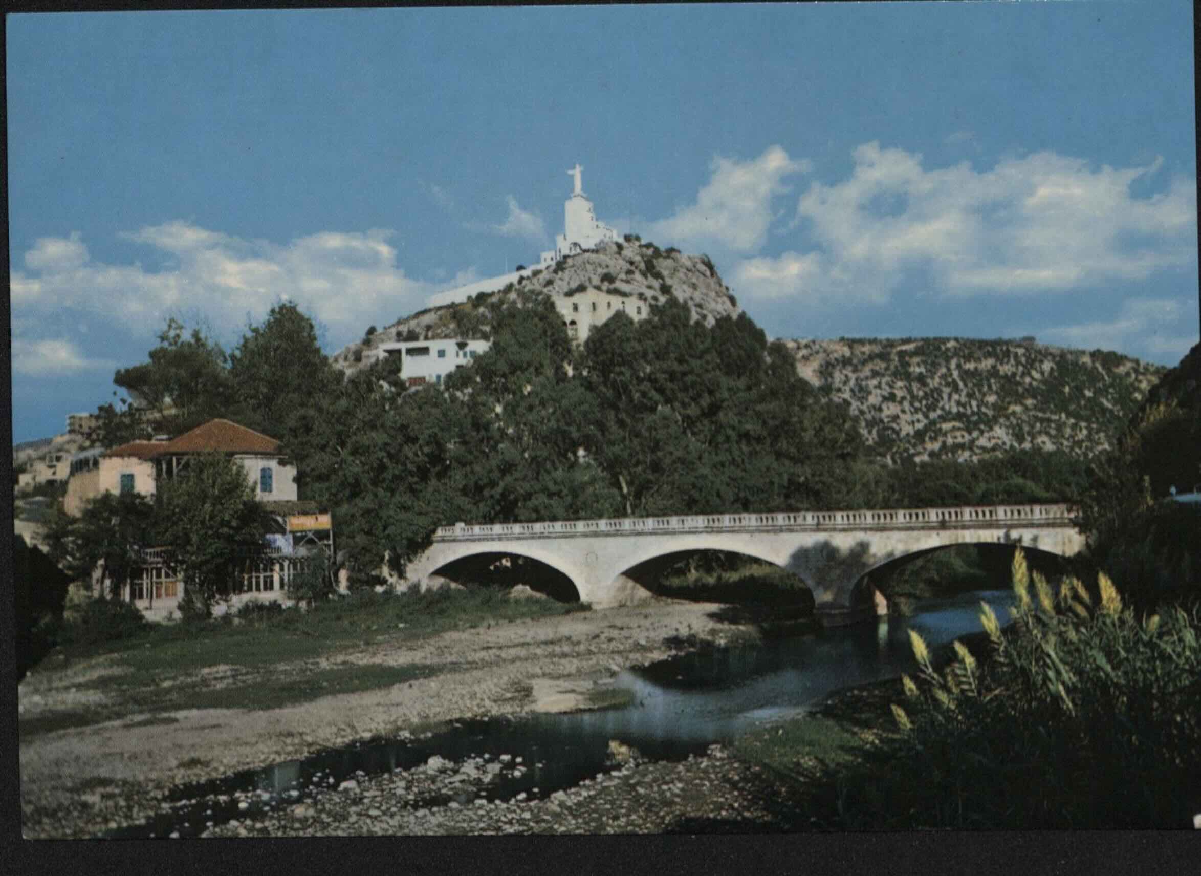 Ironically, this flipbook of images returns to Dog River. Before the téléphérique was initiated a statue similar to Harissa was built on a hill on the opposite side of most of the stele. Jesus the King (Yessou7 al Malak) was built in Zouk Mosbeh, on the Northern side of Dog River. It was a statue of Jesus, with his arms flung wide open. Just like his mother a few kilometers up the road he faced westward out to sea. Welcoming and watching - or perhaps warning, like the original dog statues. In this image a modern highway took the place where the railroad had once stood. The French and Mamlouk bridges both step back in into the depths of the valley, stagered bridges of time.
